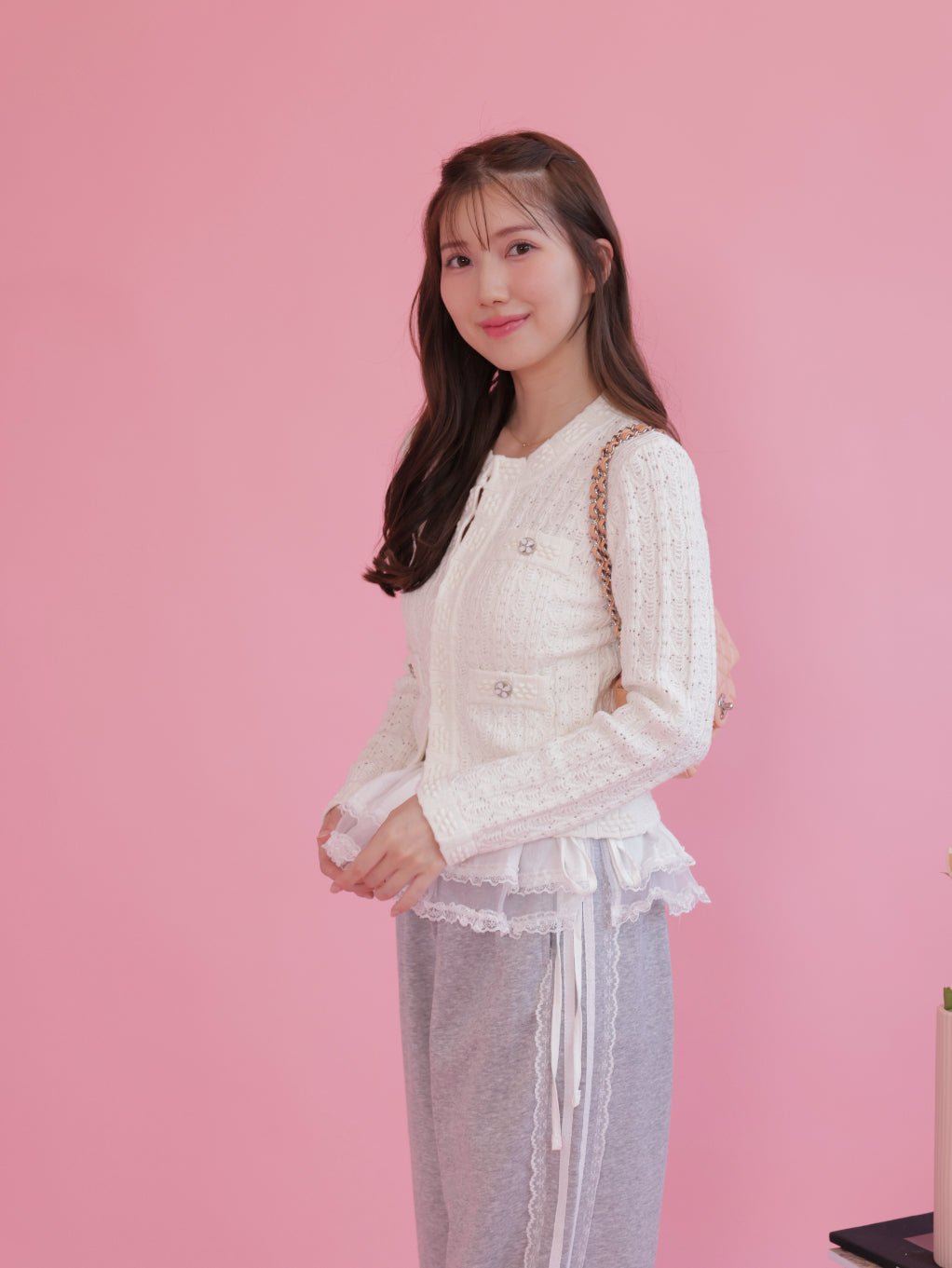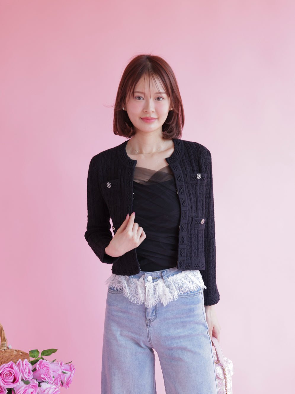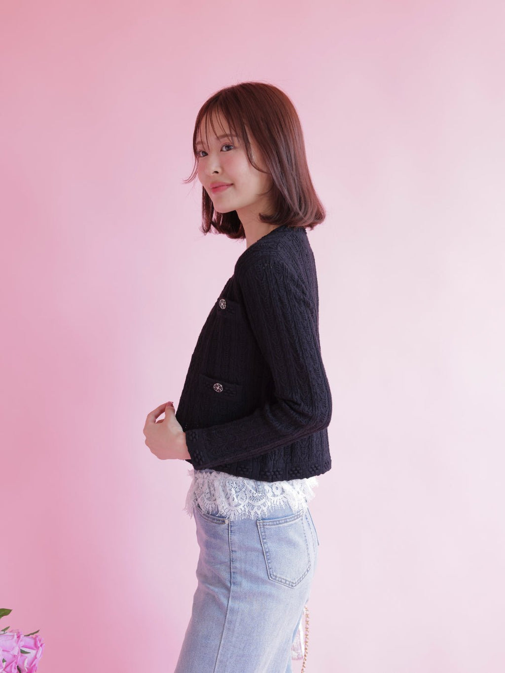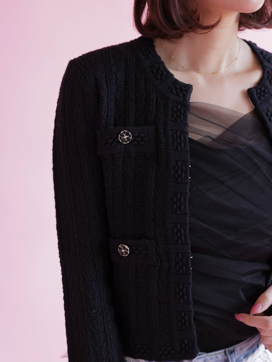 クラシカルな編地とパール調ボタンが上品なニットジャケット。きちんと感がありながらも、スウェットパンツやデニムとも好相性。オフィスからお出かけまで幅広いシーンに対応し、秋口はアウター代わりにも使える万能アイテムです♡