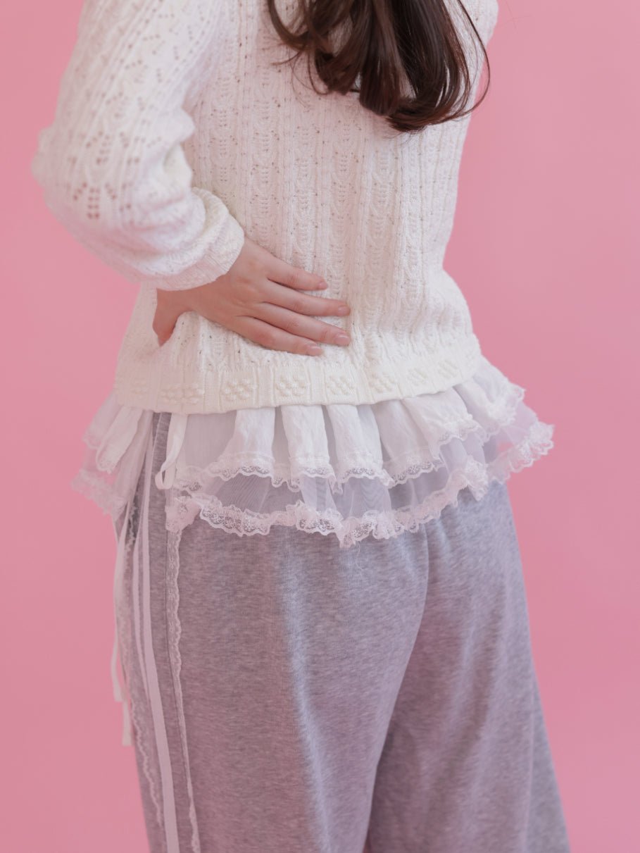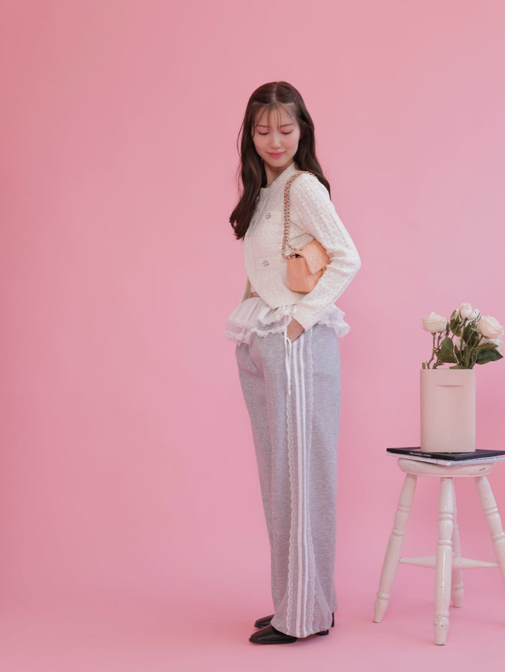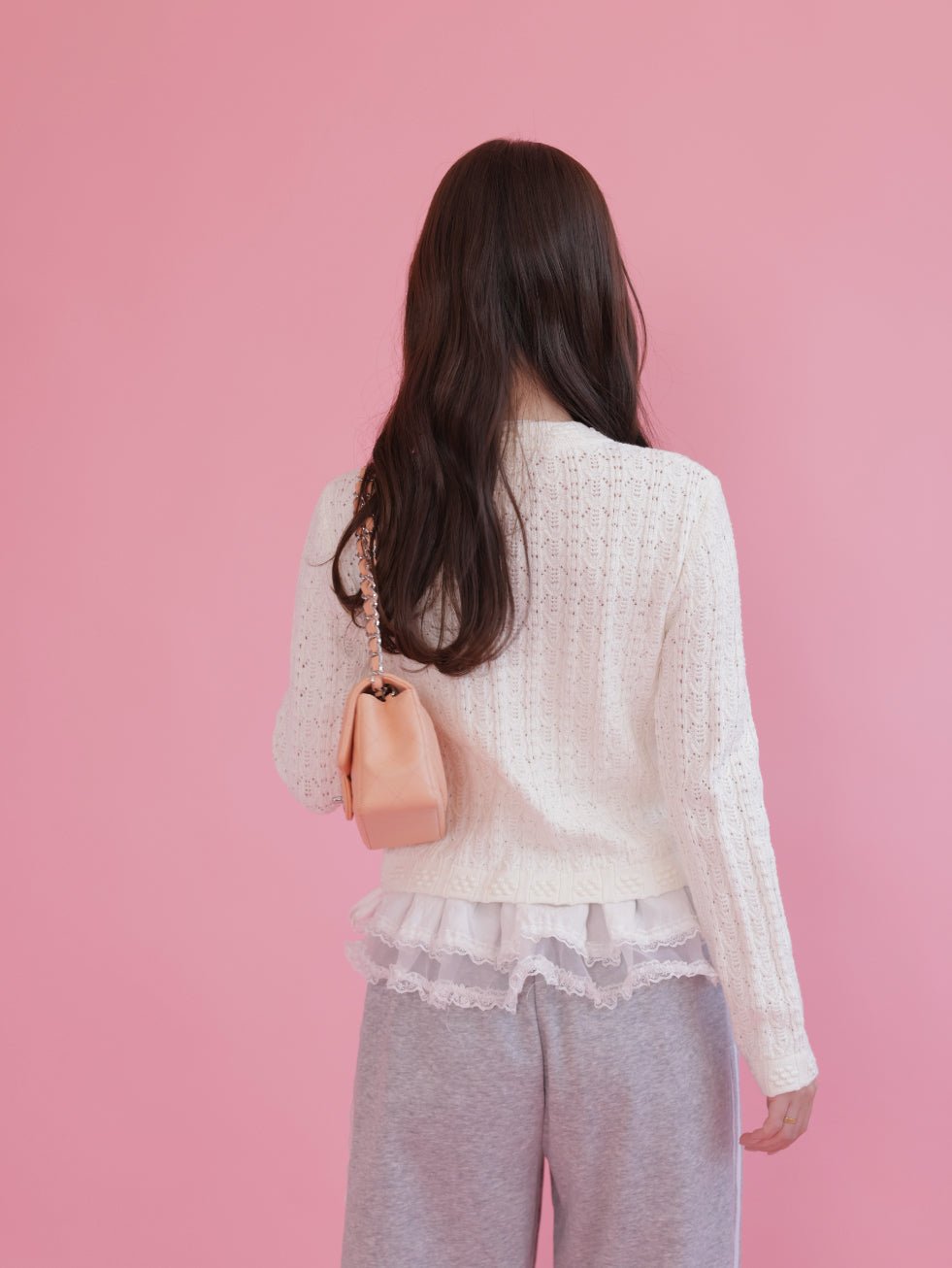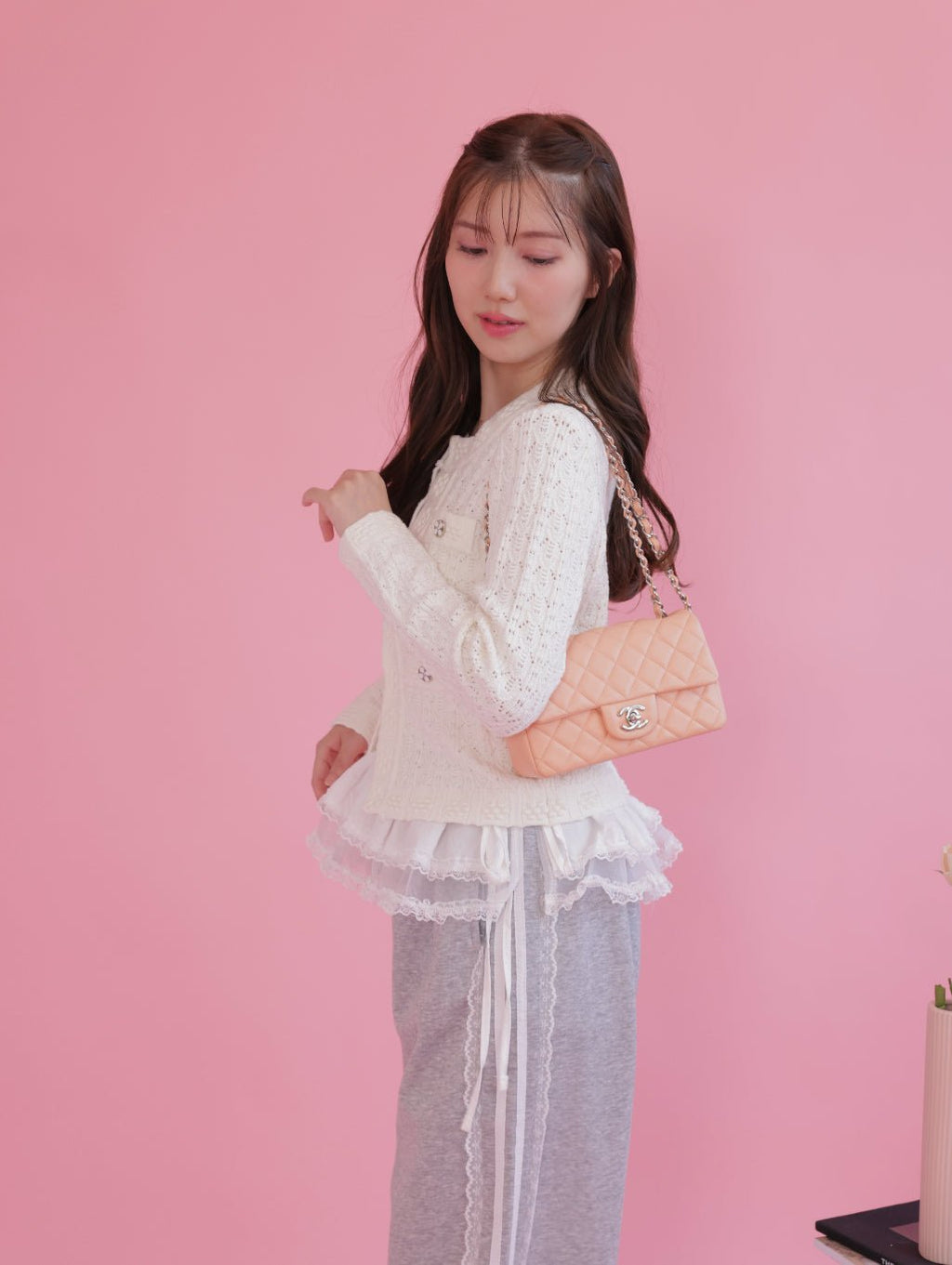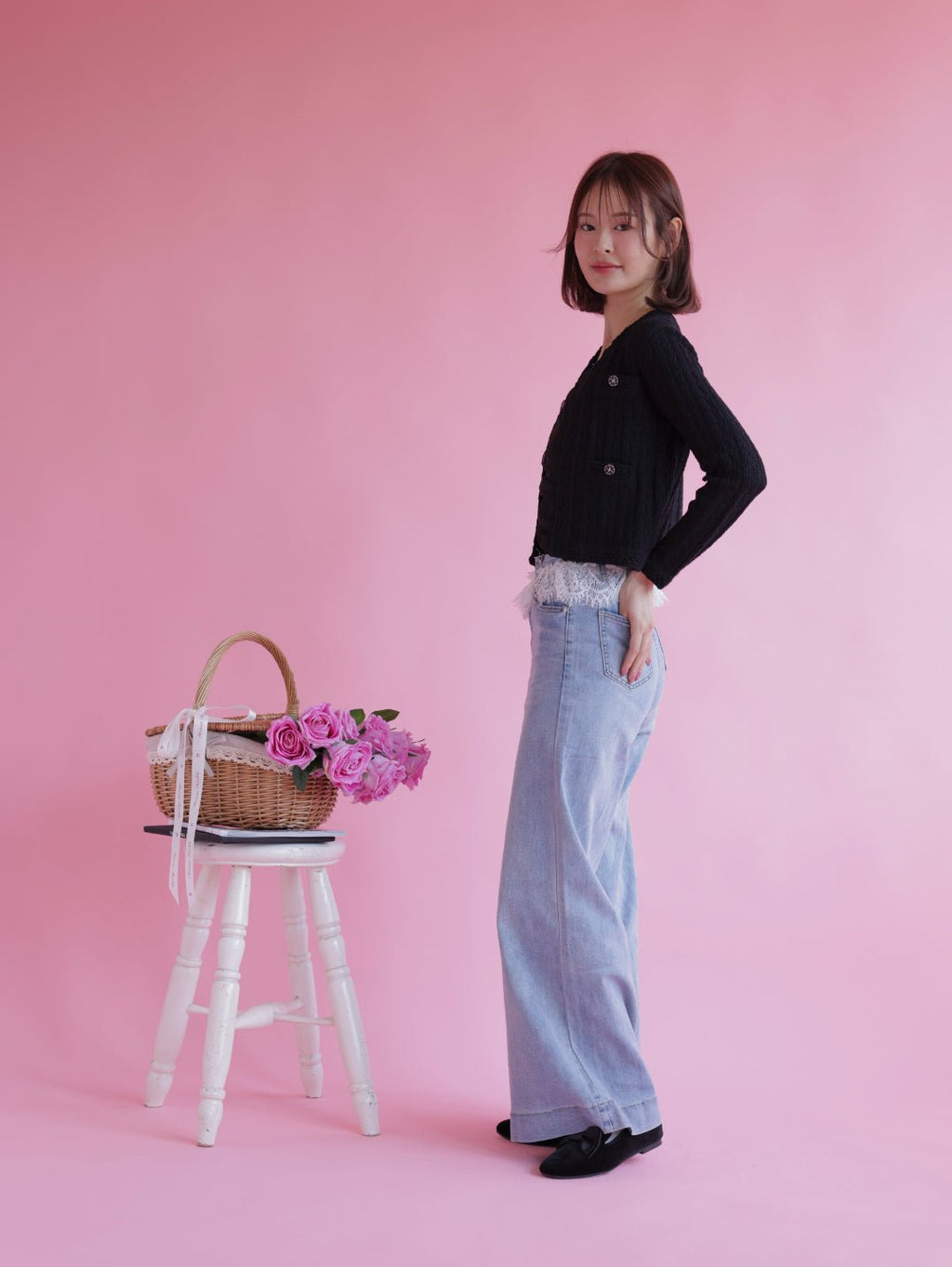 クラシカルな編地とパール調ボタンが上品なニットジャケット。きちんと感がありながらも、スウェットパンツやデニムとも好相性。オフィスからお出かけまで幅広いシーンに対応し、秋口はアウター代わりにも使える万能アイテムです♡