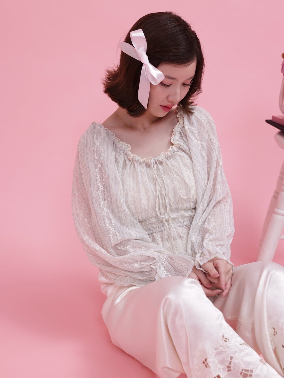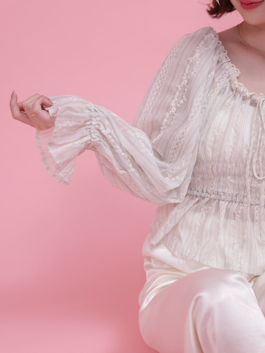 繊細なレースと柔らかなシルエットが魅力のフェミニンブラウス。フレンチムード漂うロマンティックなデザインが、女性らしい雰囲気を引き立てます。胸元のシャーリングとリボンディテールが、スタイルを美しく見せるポイント。程よい透け感が軽やかで、季節感のあるコーディネートを楽しめます♡