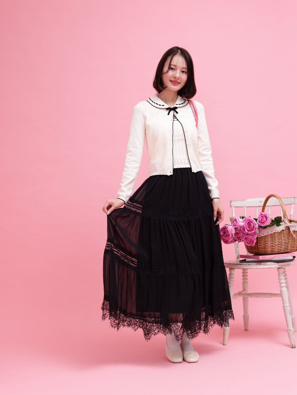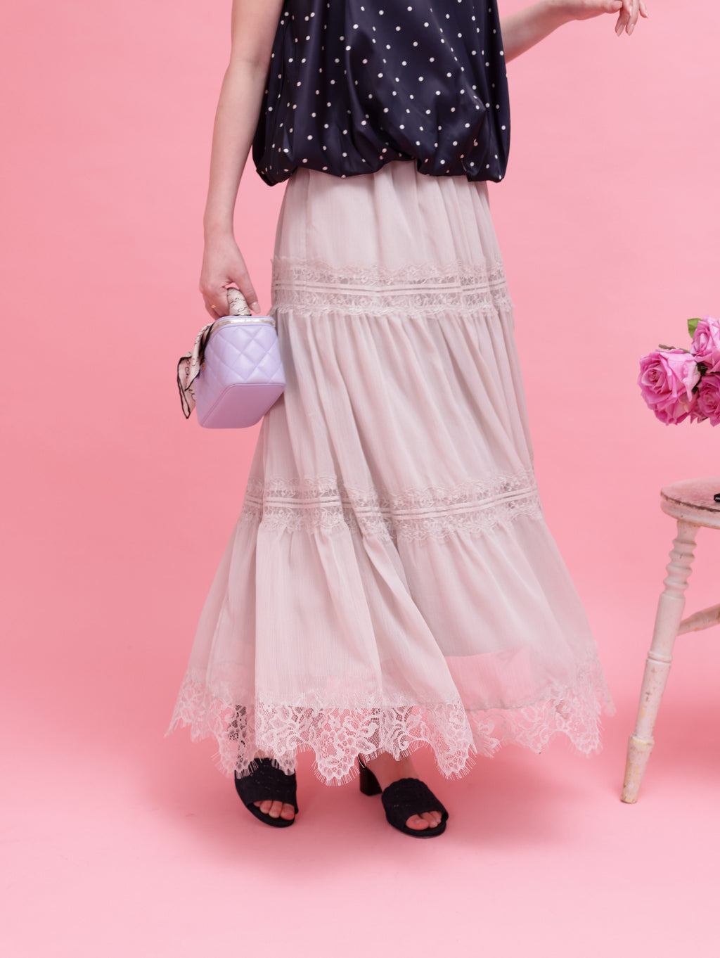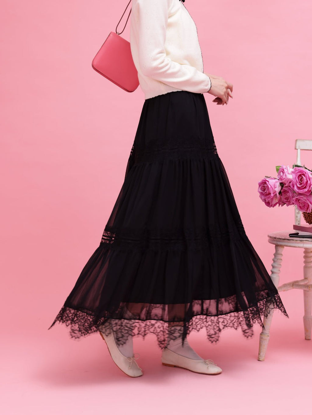繊細なレースとティアードデザインが美しいロングスカート。段々に重なるシルエットが、歩くたびに軽やかな動きを生み出します。裾にあしらわれたレースディテールが、クラシカルで上品なアクセントに♡