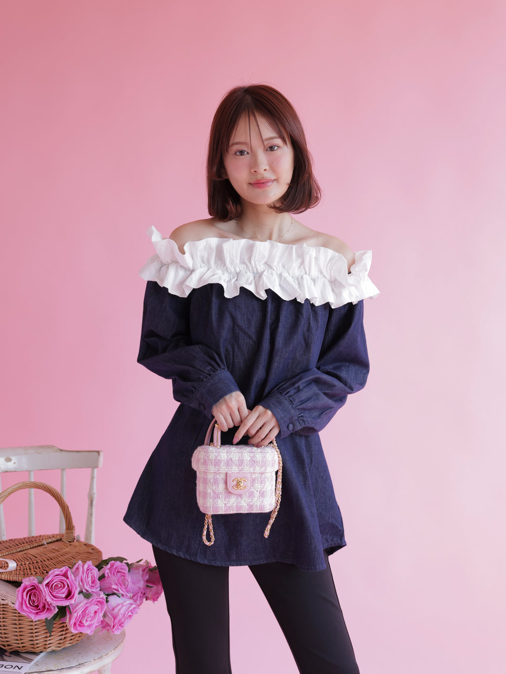 デニム素材にボリュームたっぷりのフリルをあしらった、存在感のあるフリルトップス。