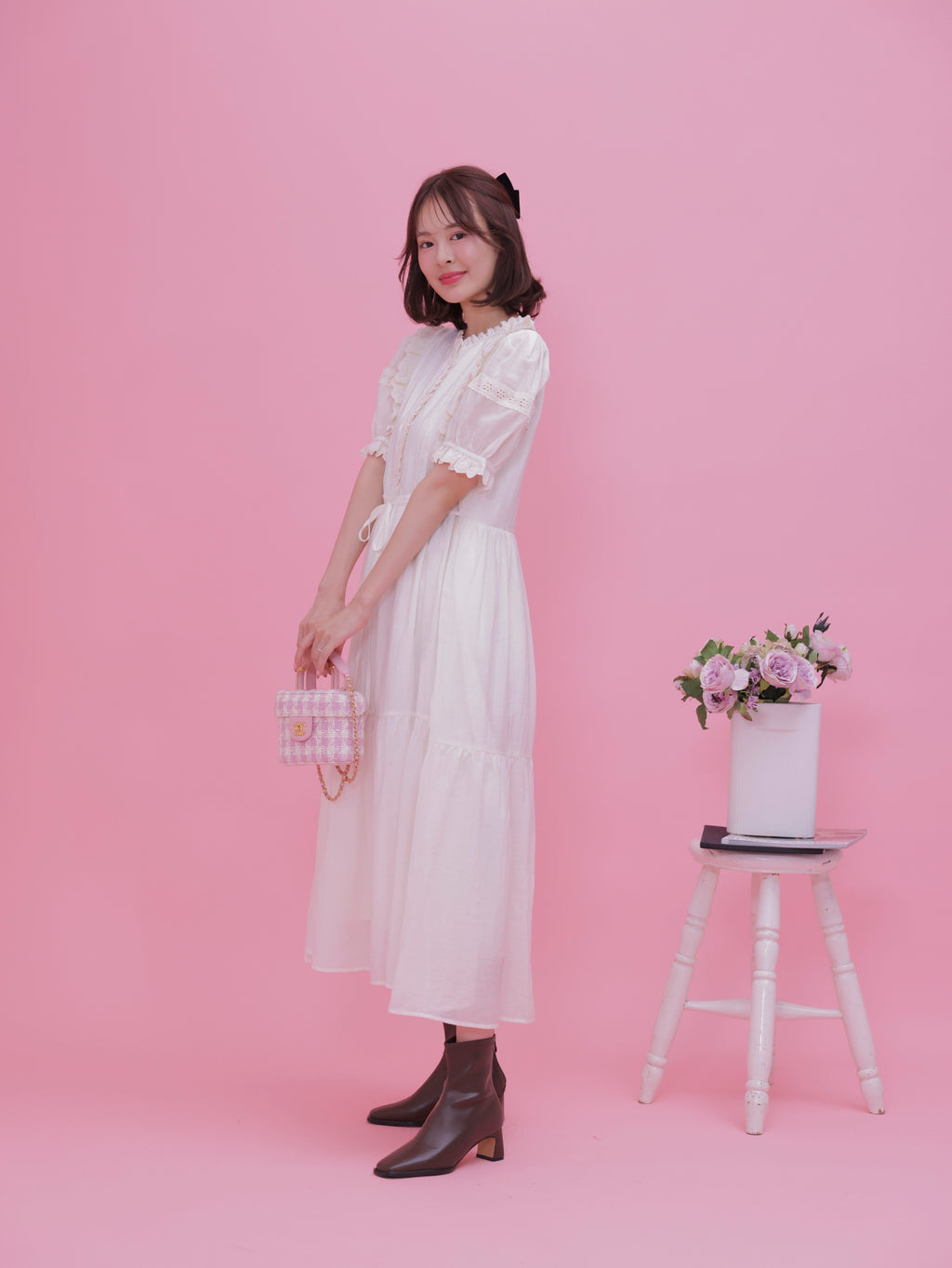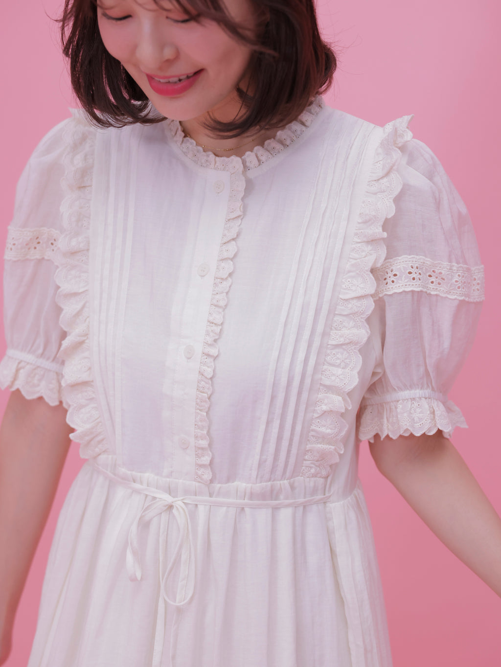 繊細なフリルとレースを贅沢にあしらった、クラシカルガーリーなワンピース。ウエストのリボンでシルエットを調整でき、スタイルアップ効果も♡