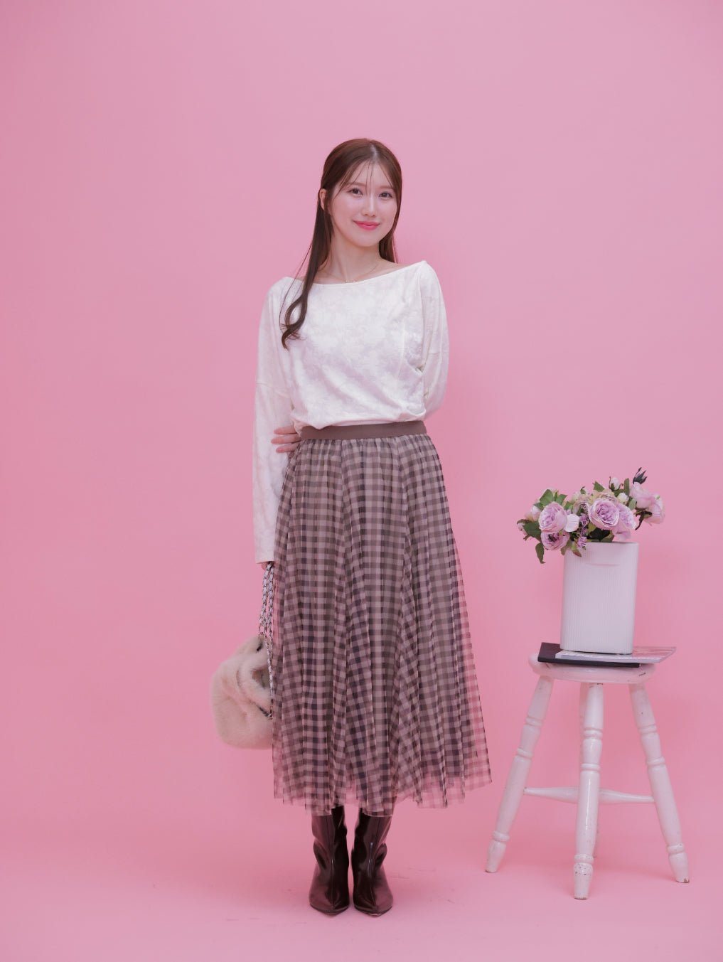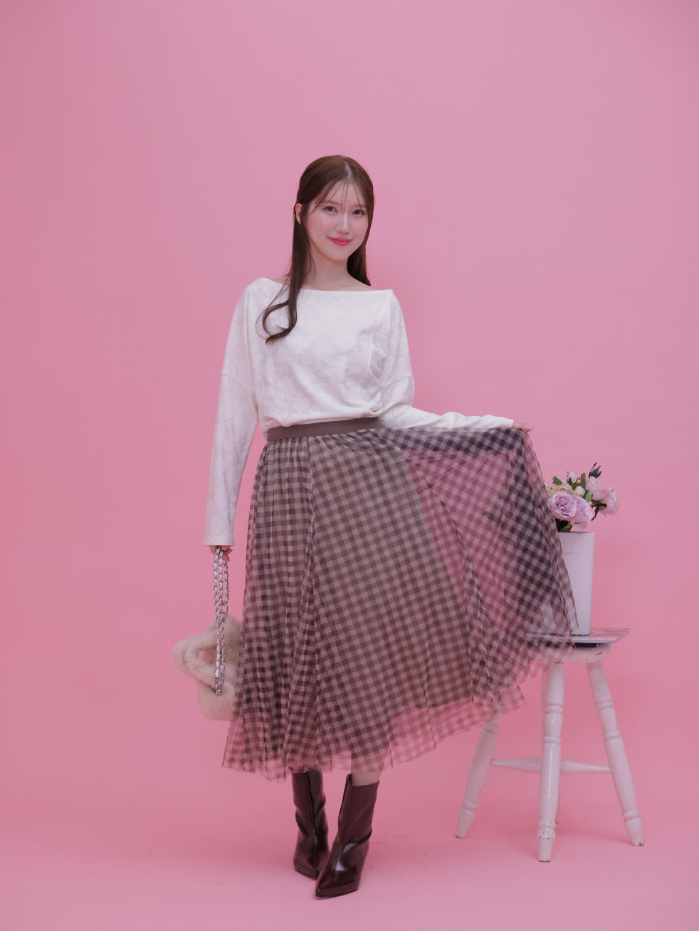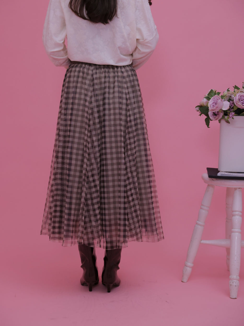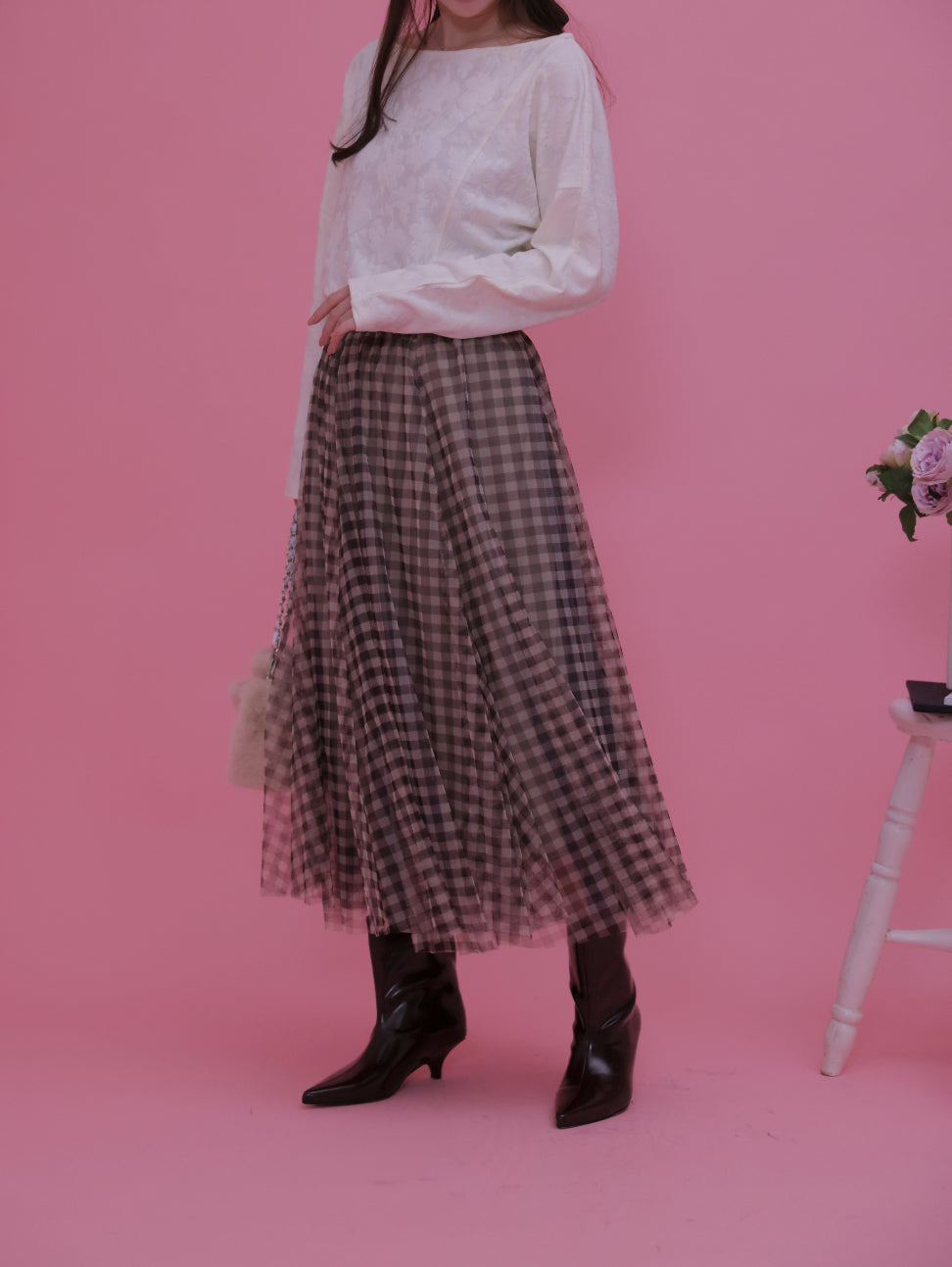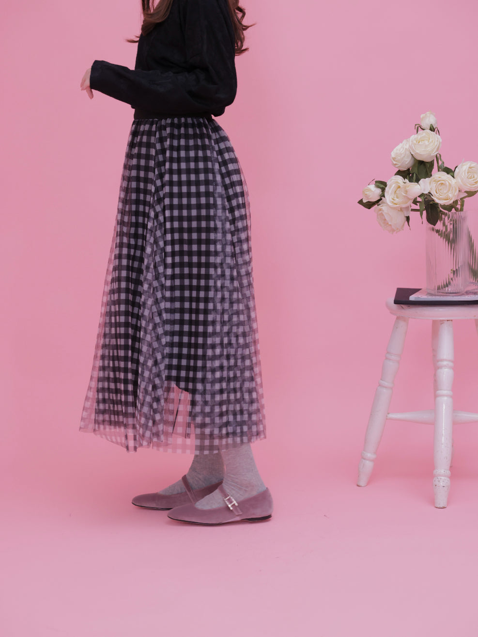 ギンガムチェックにチュールを重ねた、立体感のあるスカート。透明感のあるチュールが重なることで、軽やかさと深みの両方を楽しめるデザイン。