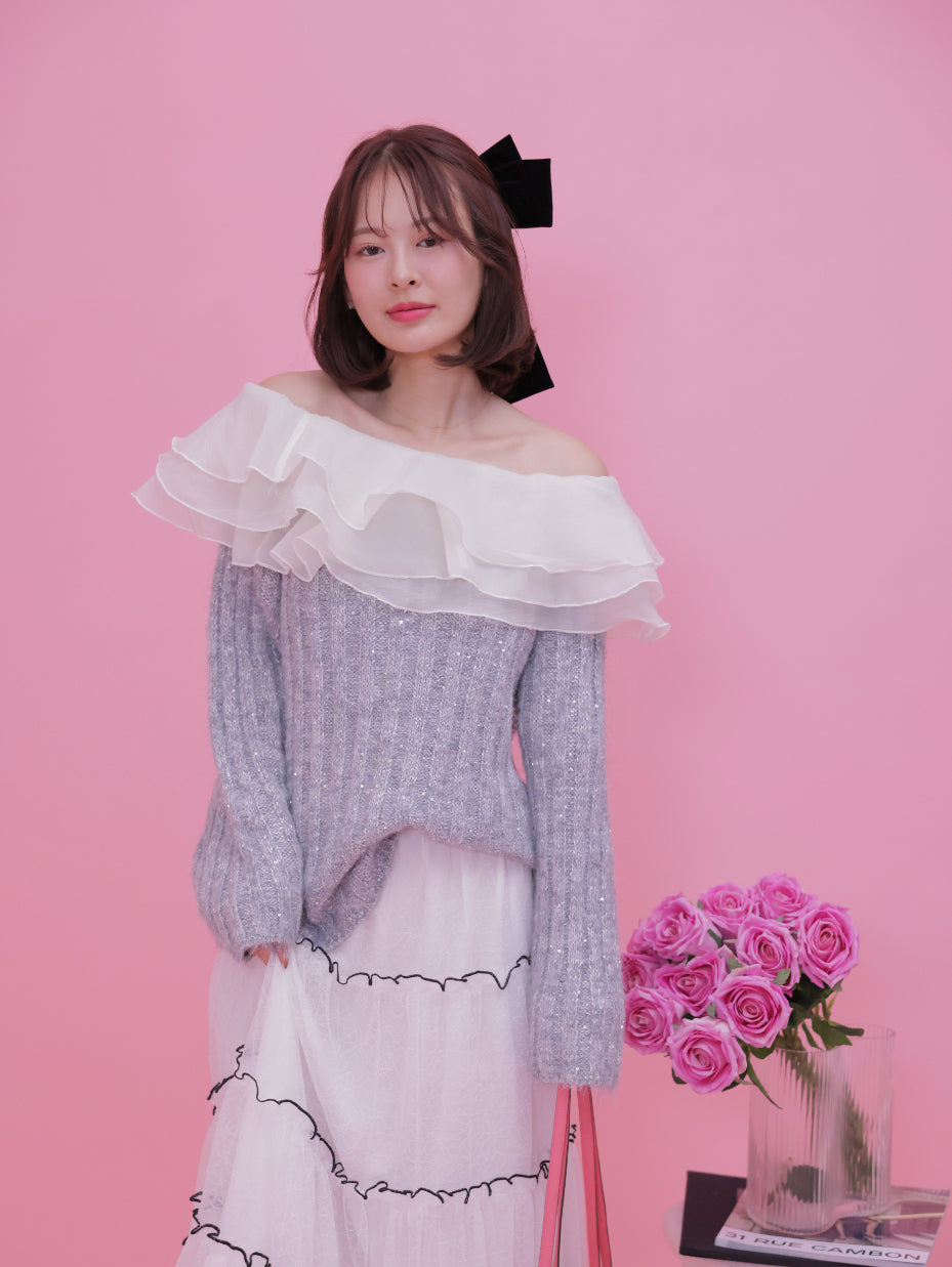 キラキラとしたスパンコールが散りばめられた、ドールライクなニットプルオーバー。たっぷりフリルのついたオフショルデザインが顔まわりを華やかに見せてくれます♡
