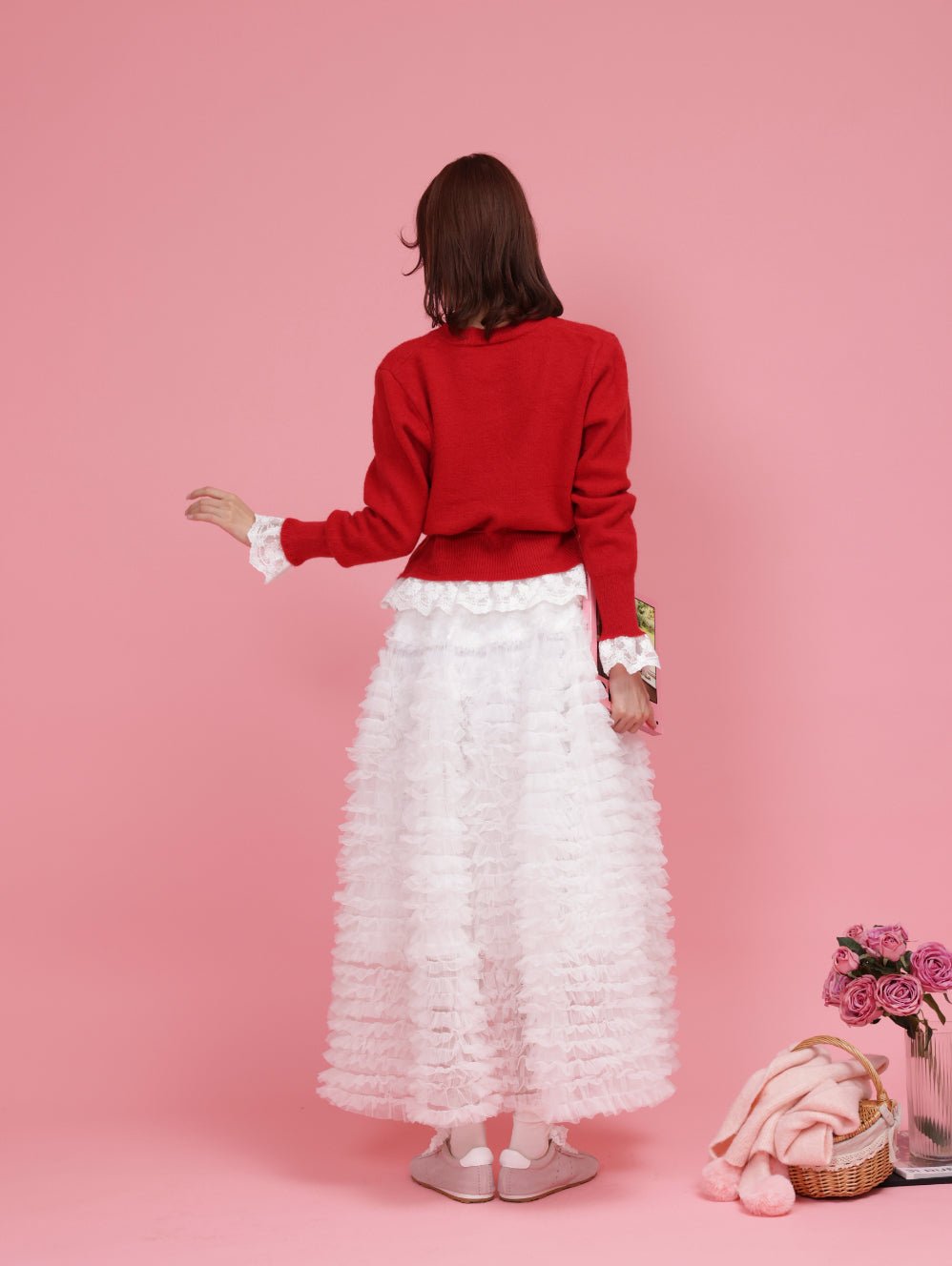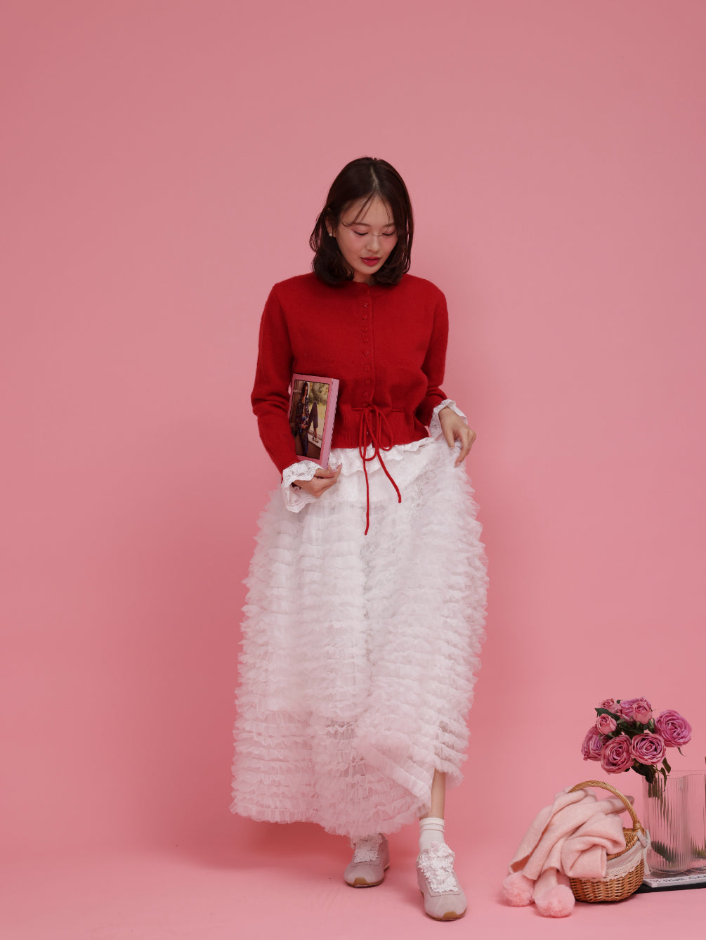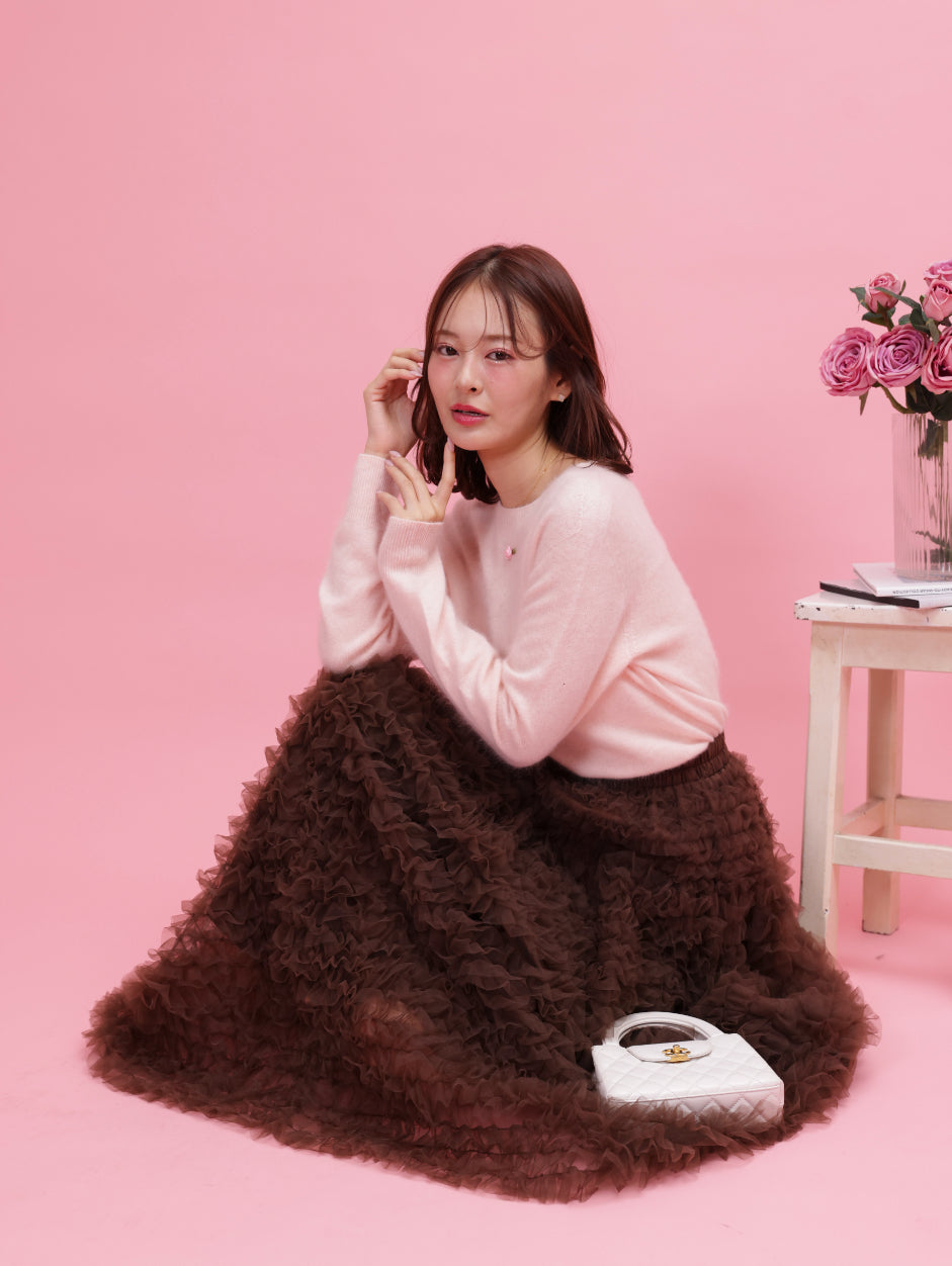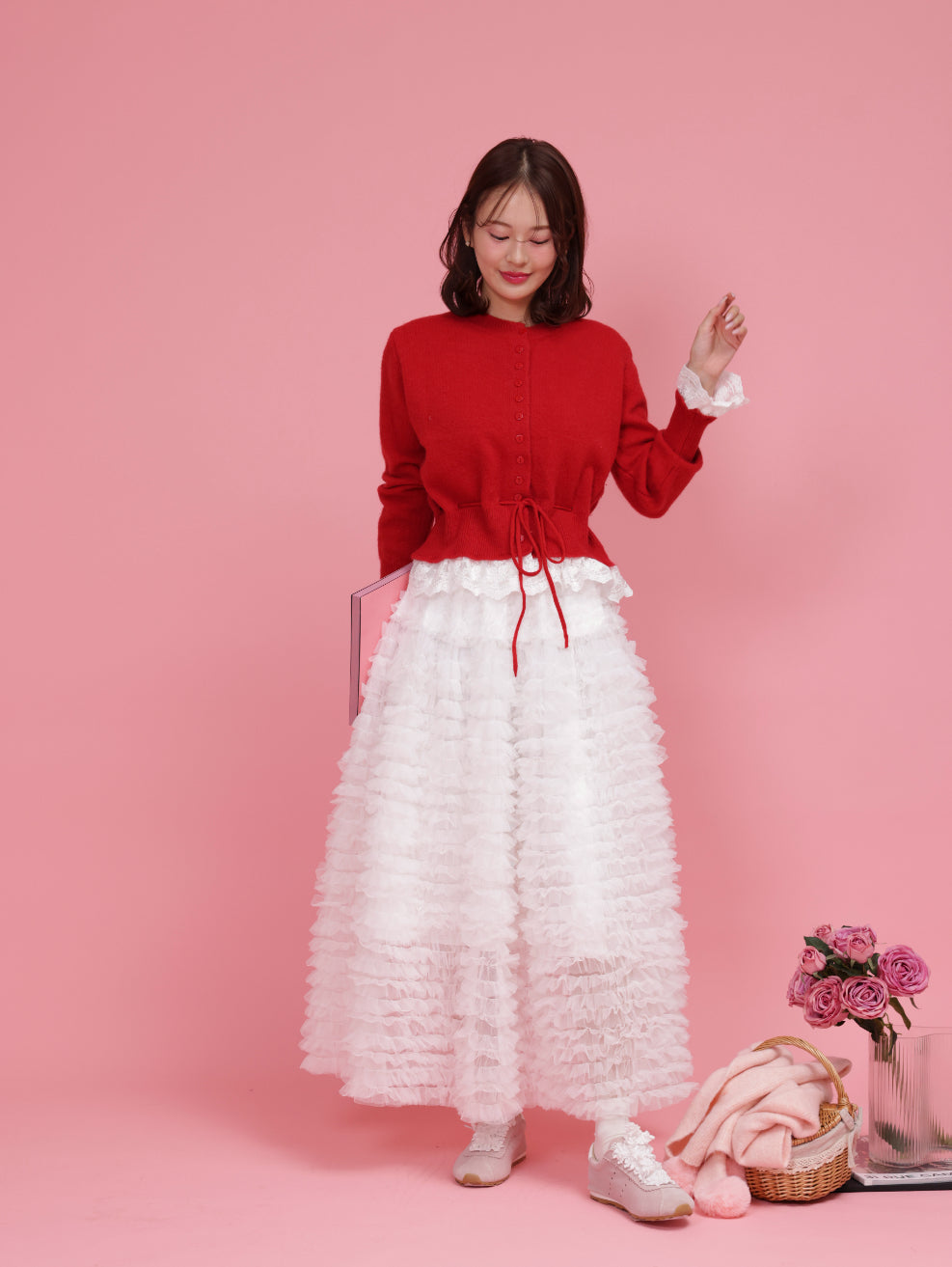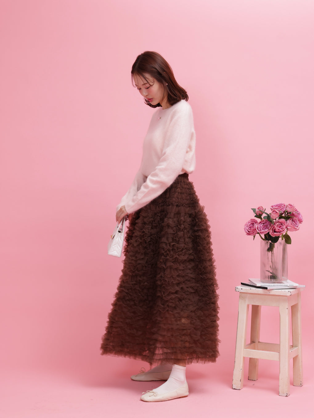 たっぷりのチュールフリルを贅沢に重ねた、存在感あふれるロングスカート。ふわりと広がるシルエットは動くたびに表情を変え、パリジェンヌのようなクラシカルな華やかさを演出します♡