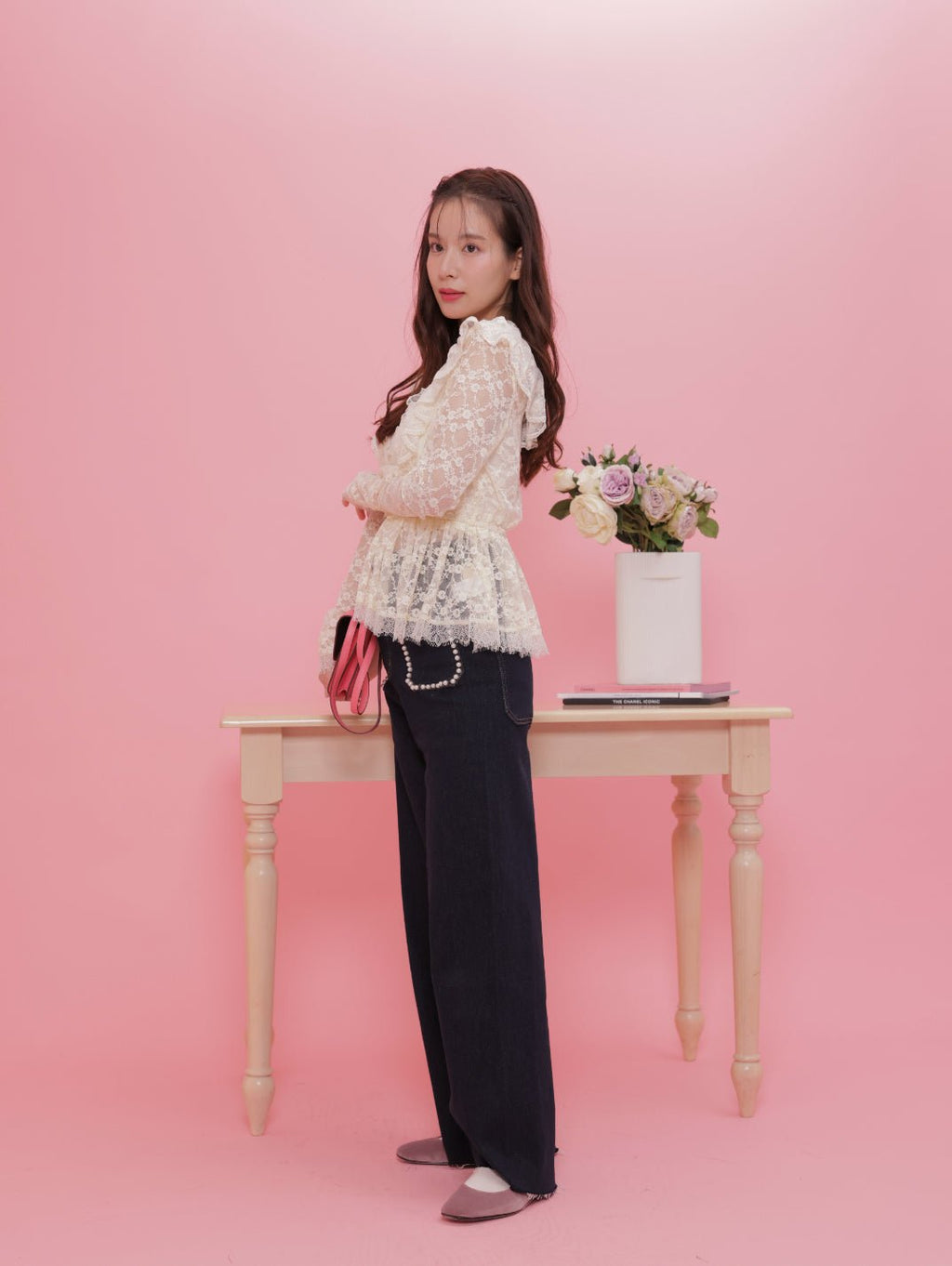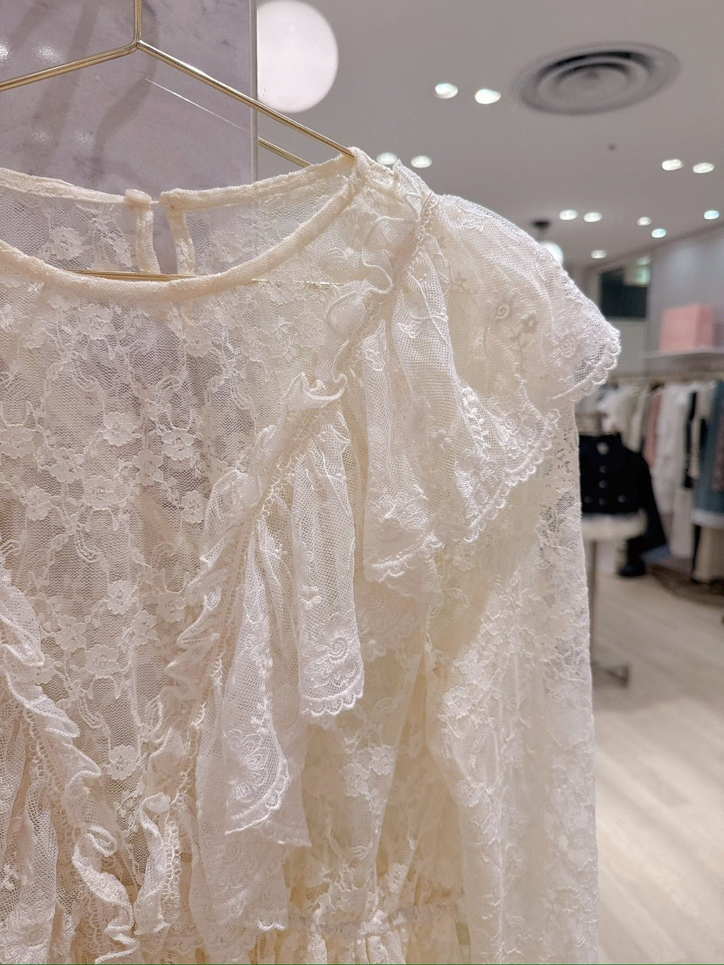 肩のフリルやペプラムシルエットがさりげなく立体感を生み、甘さの中に上品な雰囲気が宿ります。透け感が軽やかで、デニムにもスカートにも合わせやすく、コーディネート全体をふんわりと優しい印象になります♡