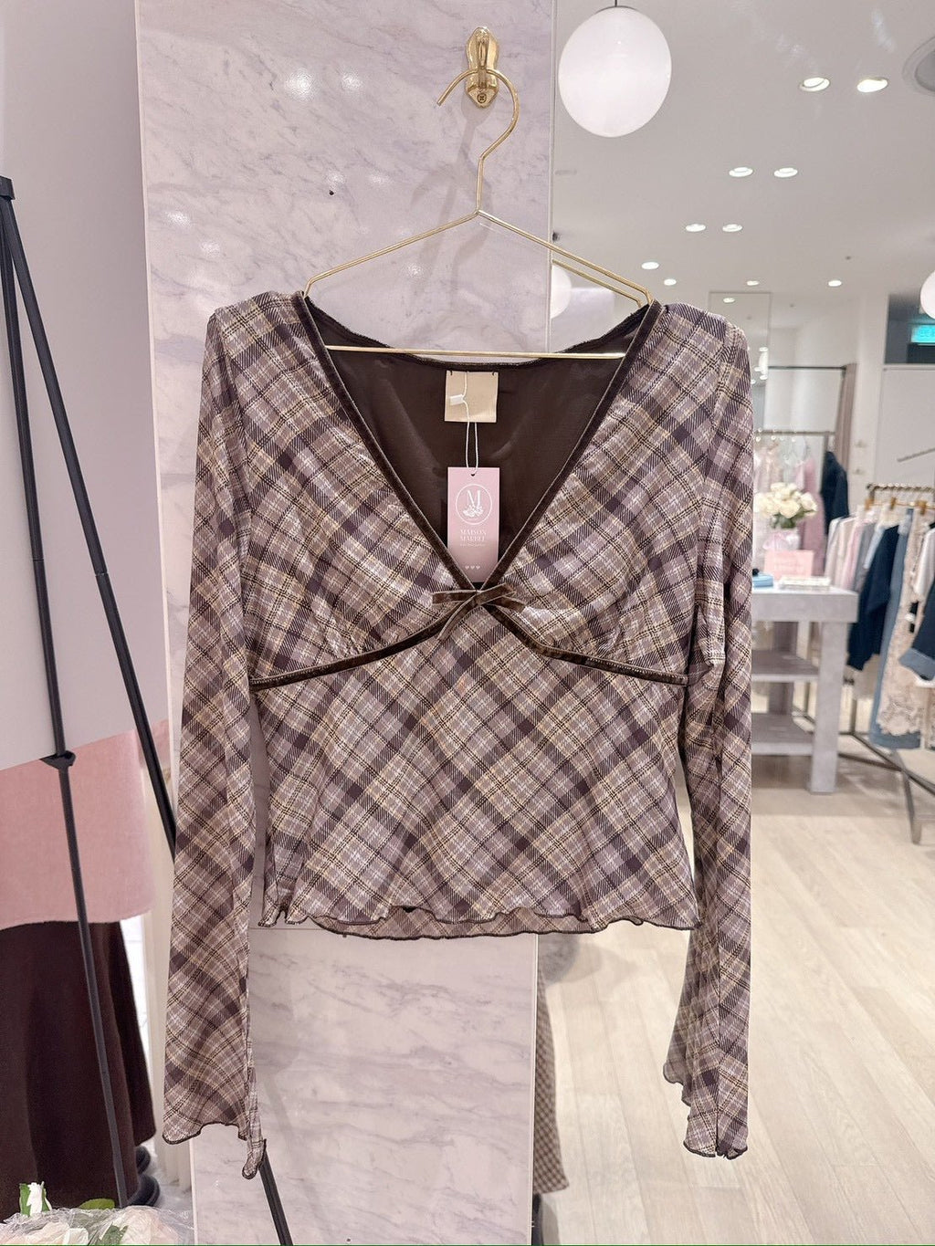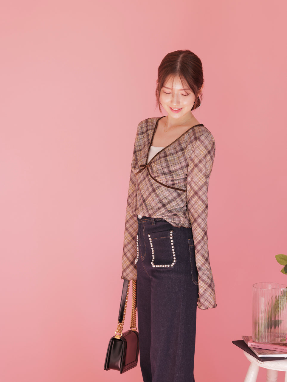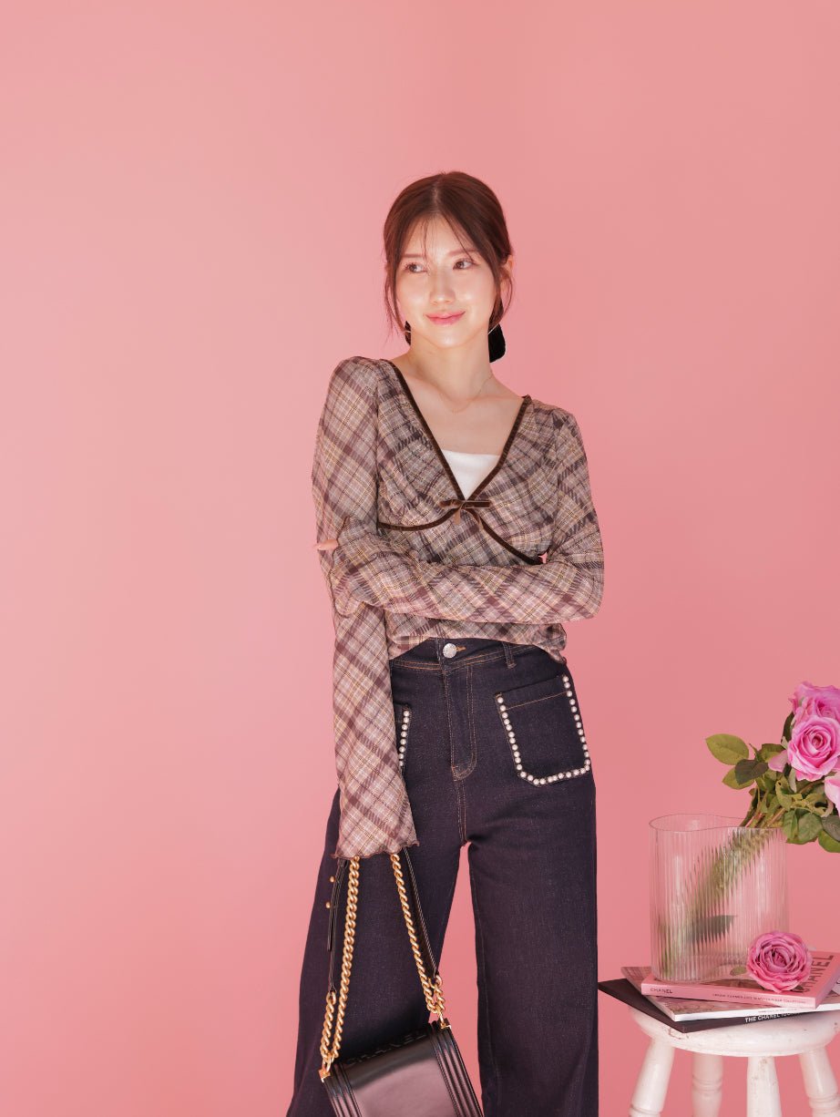 ほんのり透け感のあるシアー素材に、落ち着いたくすみカラーのチェック柄を重ねた大人かわいいトップス。胸元にはベルベット調のパイピングと小さなリボンを添えて、上品さと甘さを絶妙にプラス。