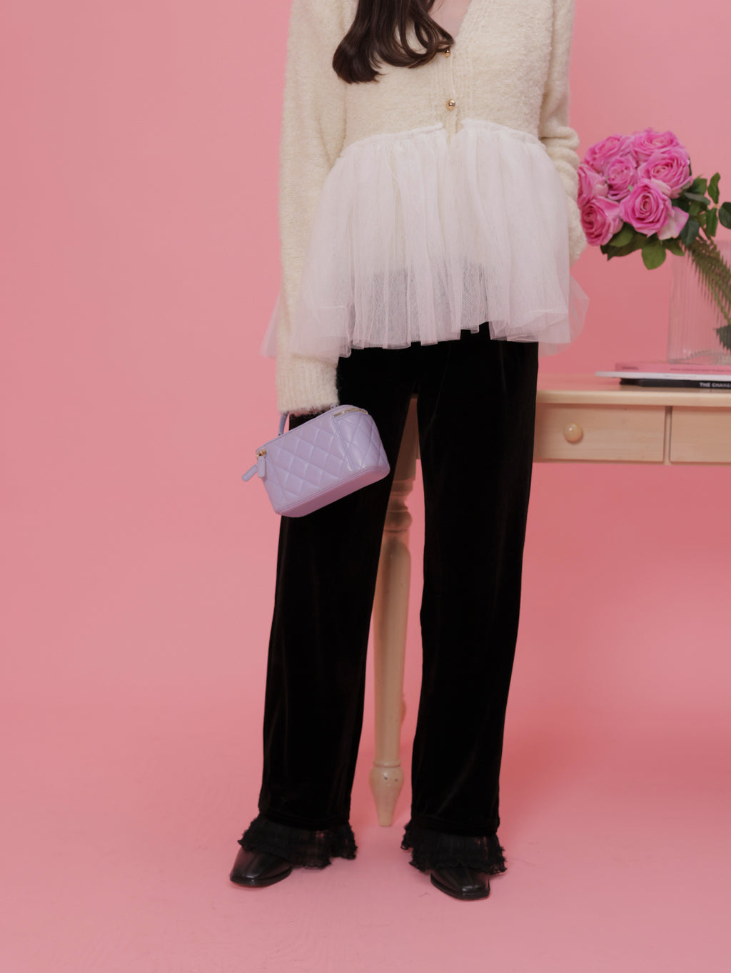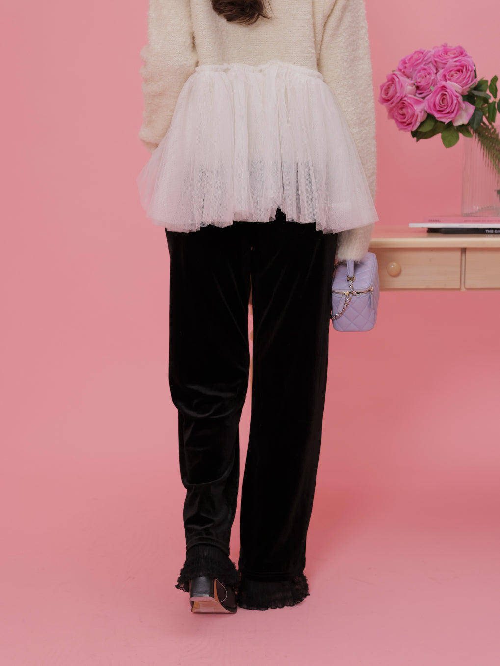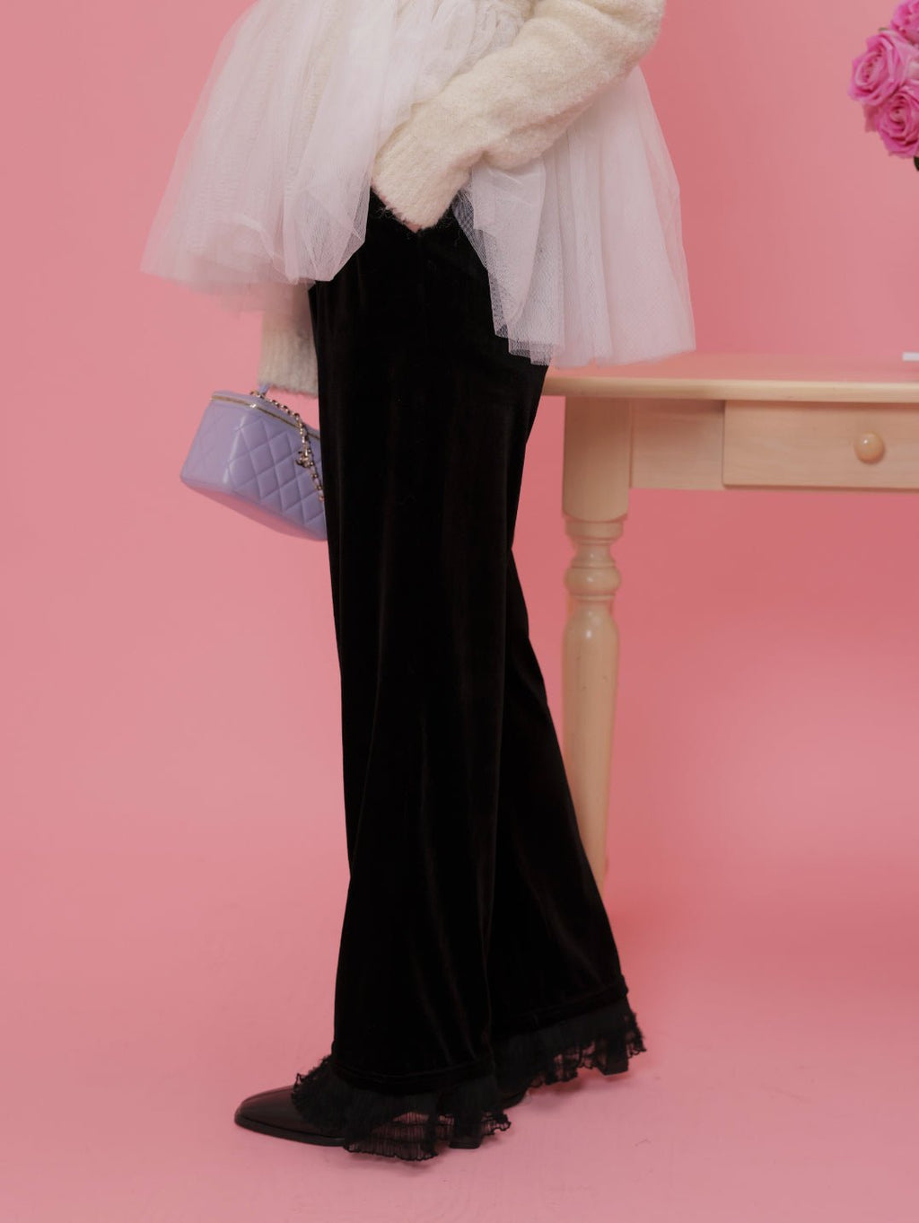 とろみのあるベロア素材が上品なムードのストレートパンツ。縦の落ち感がしっかり出るので、脚のラインをすらっと綺麗に見せてくれます。裾にはほんのりフリルを添えて、足元までガーリーさを忘れない仕上がりに。スウェットやざっくりニットと合わせても、女性らしさが自然と滲む一本です♡